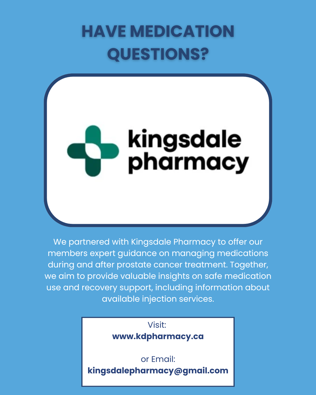 If you have any questions about your cancer medications or treatment, you can reach out to Kingsdale Pharmacy directly at kingsdalepharmacy@gmail.com or visit their website at www.kdpharmacy.ca to learn more about their on-site services and how they can support your prostate cancer journey.